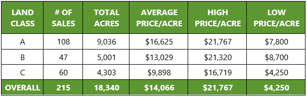 | LAND CLASS | PRICE/ACRE | # OF ACRES | SALE DATE | COUNTY |