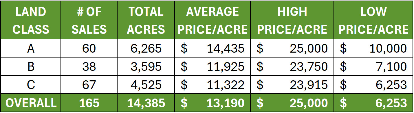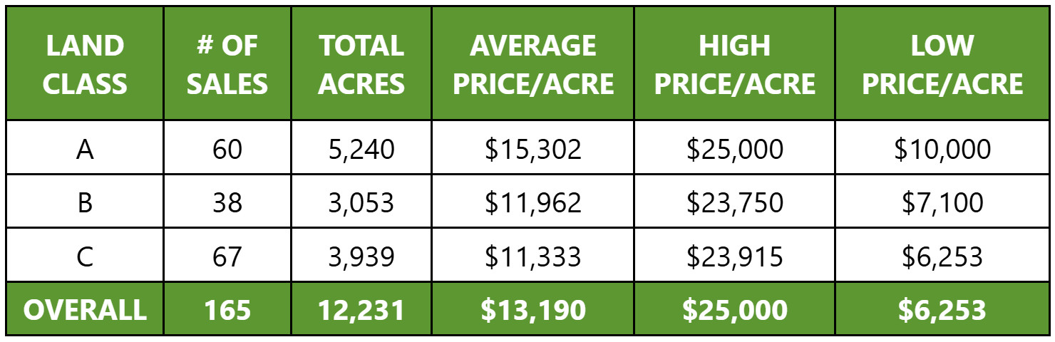 | LAND CLASS | PRICE/ACRE | # OF ACRES | SALE DATE | COUNTY |